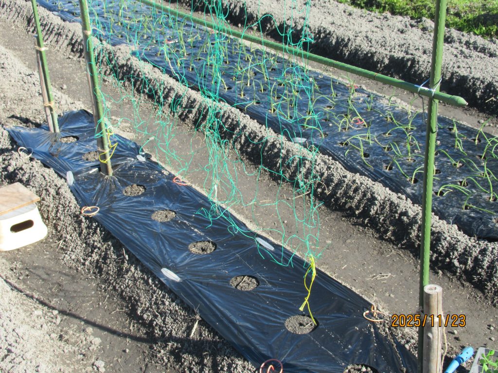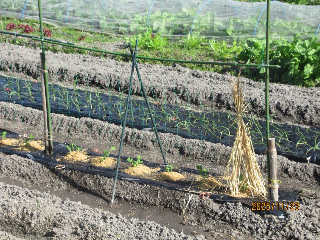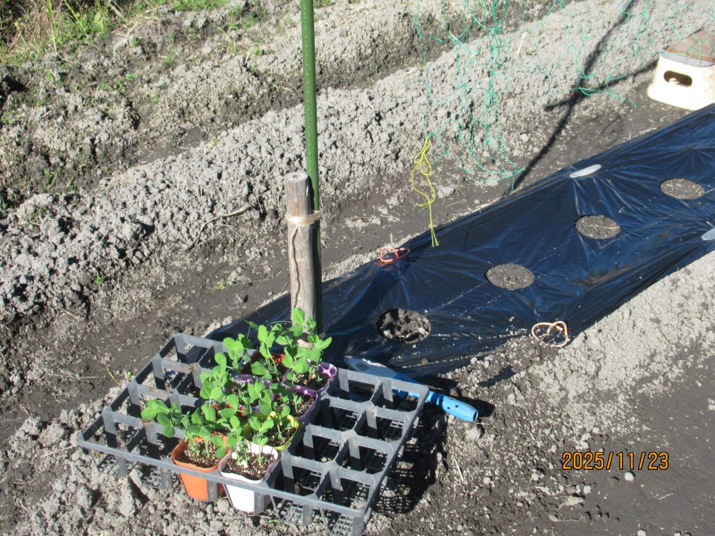 ポットで育苗していたエンドウを畑に定植。