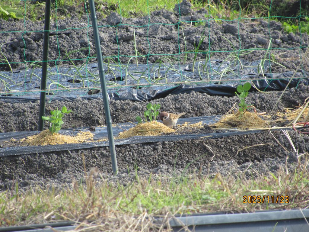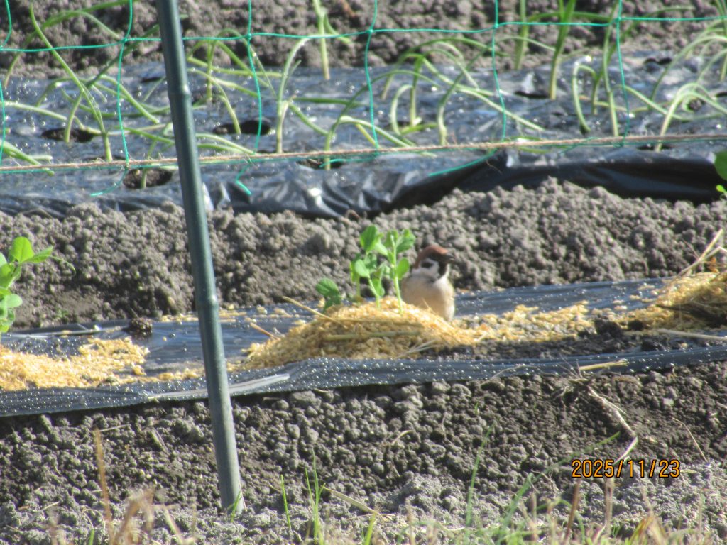 寒さ除けの藁囲いと籾殻。ススメが来訪!