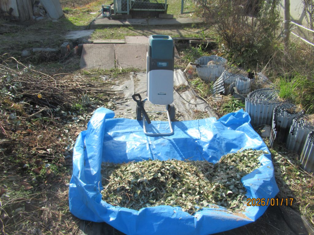 キウイの選定した枝を肥料に返すために粉砕。